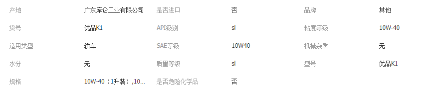 本网页所展示的有关【库仑优品K1合成机油老车专用特级抗磨SL级6000公里发动机润滑油_润滑油_广东中海南联能源有限公司惠州分公司】的信息/图片/参数等由全球零部件网的会员【广东中海南联能源有限公司惠州分公司】提供,由全球零部件网会员【广东中海南联能源有限公司惠州分公司】自行对信息/图片/参数等的真实性、准确性和合法性负责,本平台(本网站)仅提供展示服务,请谨慎交易,因交易而产生的法律关系及法律纠纷由您自行协商解决,本平台(本网站)对此不承担任何责任。您在本网页可以浏览【库仑优品K1合成机油老车专用特级抗磨SL级6000公里发动机润滑油_润滑油_广东中海南联能源有限公司惠州分公司】有关的信息/图片/价格等及提供【库仑优品K1合成机油老车专用特级抗磨SL级6000公里发动机润滑油_润滑油_广东中海南联能源有限公司惠州分公司】的商家公司简介、江南(中国)等信息。