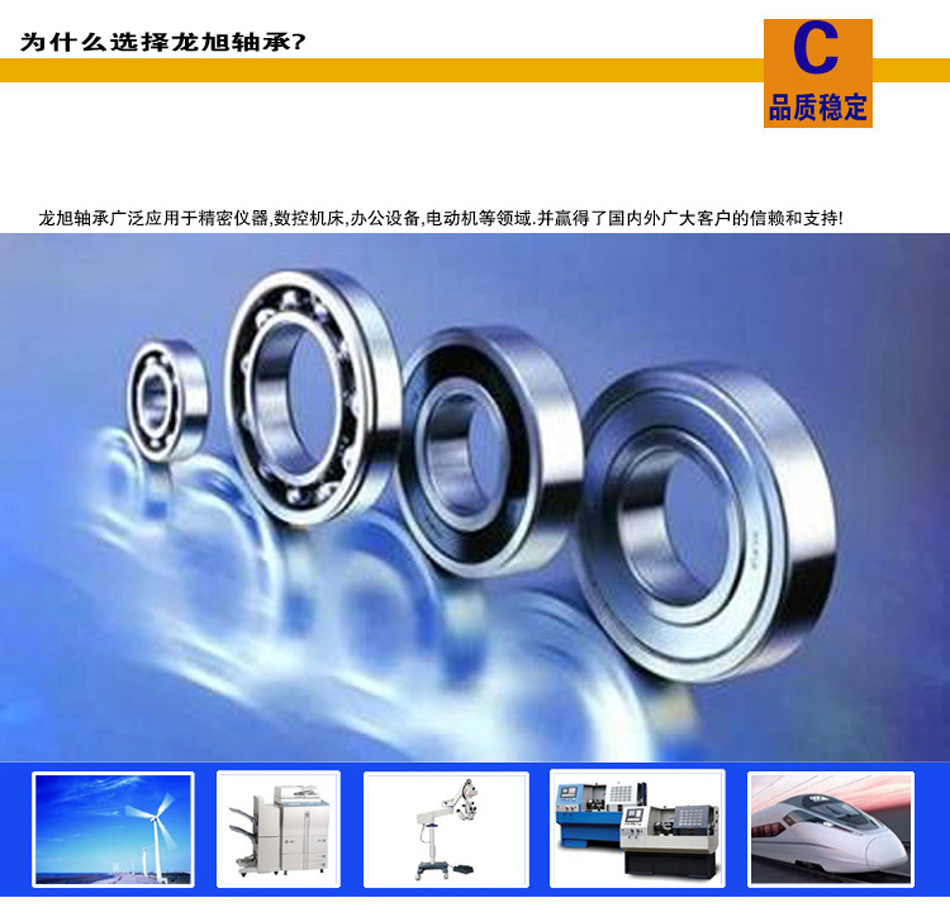 东莞市龙旭轴承有限公司是一家集生产与贸易为一体,专业生产经营内径1—60mm的微型、中小型轴承的综合型企业,主营产品包括公制及英制的深沟球轴承、不锈钢轴承、法兰盘轴承、钟表轴承、滚针轴承、单向轴承、平面推力球轴承等多类产品,广泛用于高档电动玩具、仪器仪表、食品机械、渔具、马达、微型电机、汽车电机、健身运动器材、医疗器械、电脑散热风扇、计算机、精密仪器、机械设备、家用电器、办公设备制造行业,并且还可根据客户的不同要求订制各种特殊轴承,以满足客户个性化的需求。