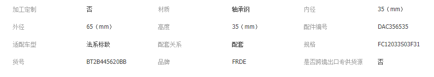 本网页所展示的有关【适用法系标致汽车轮毂轴承GB12438S01 DAC35650035ZZ FC12033S03_圆锥滚子轴承_山东弗润德轴承有限公司】的信息/图片/参数等由全球零部件网的会员【山东弗润德轴承有限公司】提供,由全球零部件网会员【山东弗润德轴承有限公司】自行对信息/图片/参数等的真实性、准确性和合法性负责,本平台(本网站)仅提供展示服务,请谨慎交易,因交易而产生的法律关系及法律纠纷由您自行协商解决,本平台(本网站)对此不承担任何责任。您在本网页可以浏览【适用法系标致汽车轮毂轴承GB12438S01 DAC35650035ZZ FC12033S03_圆锥滚子轴承_山东弗润德轴承有限公司】有关的信息/图片/价格等及提供【适用法系标致汽车轮毂轴承GB12438S01 DAC35650035ZZ FC12033S03_圆锥滚子轴承_山东弗润德轴承有限公司】的商家公司简介、江南(中国)等信息。