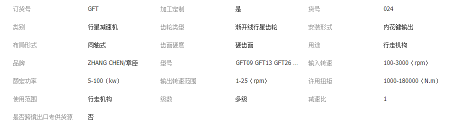 本网页所展示的有关【行走减速机GFT09 GFT13 GFT26 GFT36 GFT40 GFT60 GFT80 GFT 110_液压减速机_上海章臣机械制造有限公司】的信息/图片/参数等由全球零部件网的会员【上海章臣机械制造有限公司】提供,由全球零部件网会员【上海章臣机械制造有限公司】自行对信息/图片/参数等的真实性、准确性和合法性负责,本平台(本网站)仅提供展示服务,请谨慎交易,因交易而产生的法律关系及法律纠纷由您自行协商解决,本平台(本网站)对此不承担任何责任。您在本网页可以浏览【行走减速机GFT09 GFT13 GFT26 GFT36 GFT40 GFT60 GFT80 GFT 110_液压减速机_上海章臣机械制造有限公司】有关的信息/图片/价格等及提供【行走减速机GFT09 GFT13 GFT26 GFT36 GFT40 GFT60 GFT80 GFT 110_液压减速机_上海章臣机械制造有限公司】的商家公司简介、江南(中国)等信息。