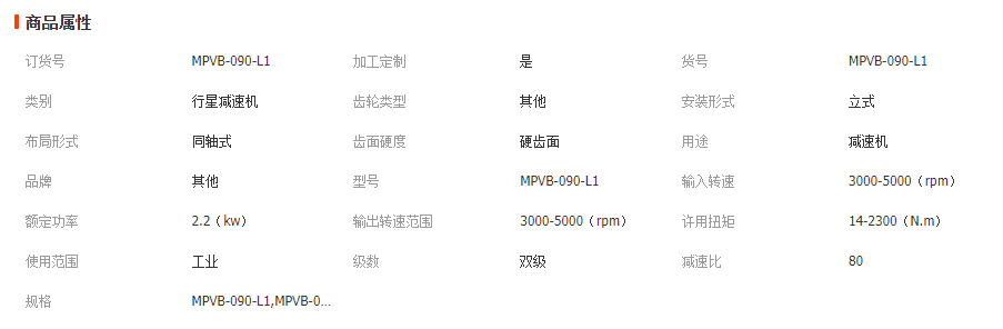 v 行星减速器内部齿轮采用20CrMnTi渗碳淬火和磨齿具有体积小、重量轻,承载能力高,使用寿命长、运转平稳,噪声低、输出扭矩大,速比大、效率高、性能安全的特点。兼具功率分流、多齿啮合独用的特性。是一种具有广泛通用性的新型减速机。最大输入功率可达104kW。适用于起重运输、工程机械、冶金、矿山、石油化工、建筑机械、轻工纺织、医疗器械、仪器仪表、汽车、船舶、兵器和航空航天等工业部门行星系列新品种WGN定轴传动减速器、WN子母齿轮传动减速器、弹性均载少齿差减速器。