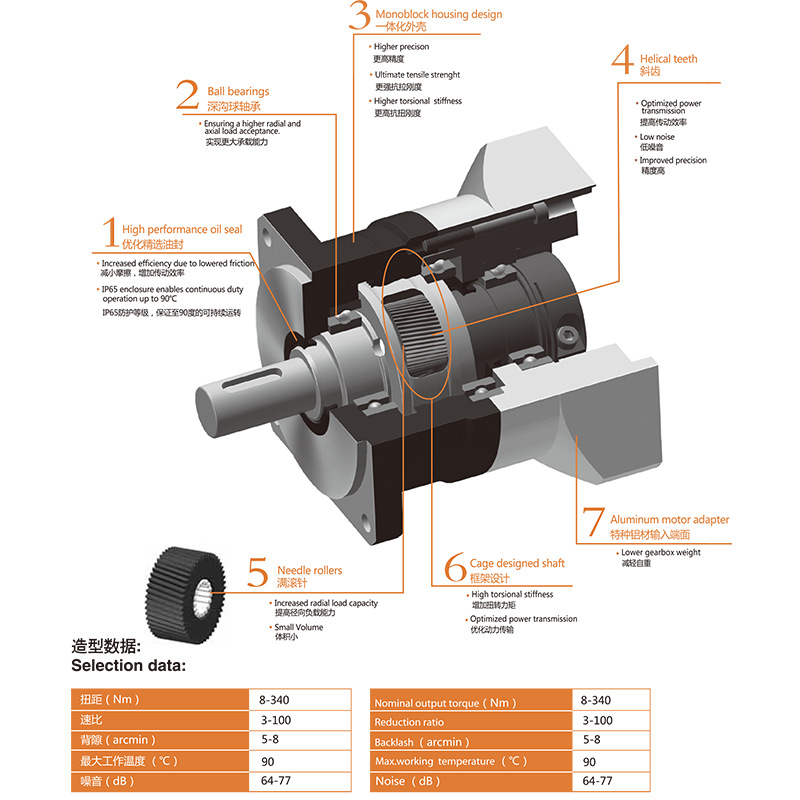 v 相对其他减速机,行星减速机具有高刚性,高精度(单级可做到1分以内),高传动效率(单级在97%-98%),高的 扭矩/体积比,终身免维护等特点.