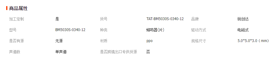产品型号:TAT-BM5030S-0340-1201 5.0×5.0×3.0 Approx 0.6g 3 Vo-p 2~4 Vo-p Max.90mA ,at 4.0KHz 50% duty Square Wave 3Vo-p Min. 75dB,at 4.0KHz 50% duty Square Wave 3Vo-p 12±2.5Ω 4000Hz