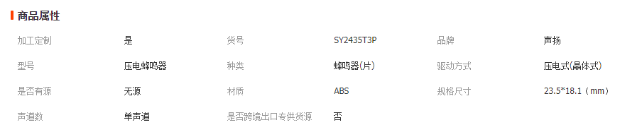 本网页所展示的有关【2435T3P压电式无源插针蜂鸣器烟雾报警器专用 三脚支架三极蜂鸣器_蜂鸣器_深圳市声扬电子有限公司】的信息/图片/参数等由全球零部件网的会员【深圳市声扬电子有限公司】提供,由全球零部件网会员【深圳市声扬电子有限公司】自行对信息/图片/参数等的真实性、准确性和合法性负责,本平台(本网站)仅提供展示服务,请谨慎交易,因交易而产生的法律关系及法律纠纷由您自行协商解决,本平台(本网站)对此不承担任何责任。您在本网页可以浏览【2435T3P压电式无源插针蜂鸣器烟雾报警器专用 三脚支架三极蜂鸣器_蜂鸣器_深圳市声扬电子有限公司】有关的信息/图片/价格等及提供【2435T3P压电式无源插针蜂鸣器烟雾报警器专用 三脚支架三极蜂鸣器_蜂鸣器_深圳市声扬电子有限公司】的商家公司简介、江南(中国)等信息。