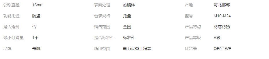 本网页所展示的有关【电力防盗母 热镀锌滚珠式防盗螺母 圆型复合式双珠螺帽_螺母_河北奇帆紧固件制造有限公司】的信息/图片/参数等由全球零部件网的会员【河北奇帆紧固件制造有限公司】提供,由全球零部件网会员【河北奇帆紧固件制造有限公司】自行对信息/图片/参数等的真实性、准确性和合法性负责,本平台(本网站)仅提供展示服务,请谨慎交易,因交易而产生的法律关系及法律纠纷由您自行协商解决,本平台(本网站)对此不承担任何责任。您在本网页可以浏览【电力防盗母 热镀锌滚珠式防盗螺母 圆型复合式双珠螺帽_螺母_河北奇帆紧固件制造有限公司】有关的信息/图片/价格等及提供【电力防盗母 热镀锌滚珠式防盗螺母 圆型复合式双珠螺帽_螺母_河北奇帆紧固件制造有限公司】的商家公司简介、江南(中国)等信息。