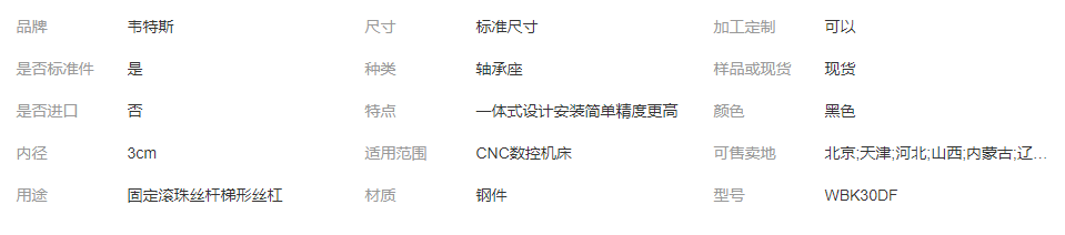 本网页所展示的有关【韦特斯丝杆支撑座 型号WBK30DF 重载轴承座 高负荷座系列_轴承附件_山东韦特斯自动化科技有限公司】的信息/图片/参数等由全球零部件网的会员【山东韦特斯自动化科技有限公司】提供,由全球零部件网会员【山东韦特斯自动化科技有限公司】自行对信息/图片/参数等的真实性、准确性和合法性负责,本平台(本网站)仅提供展示服务,请谨慎交易,因交易而产生的法律关系及法律纠纷由您自行协商解决,本平台(本网站)对此不承担任何责任。您在本网页可以浏览【韦特斯丝杆支撑座 型号WBK30DF 重载轴承座 高负荷座系列_轴承附件_山东韦特斯自动化科技有限公司】有关的信息/图片/价格等及提供【韦特斯丝杆支撑座 型号WBK30DF 重载轴承座 高负荷座系列_轴承附件_山东韦特斯自动化科技有限公司】的商家公司简介、江南(中国)等信息。