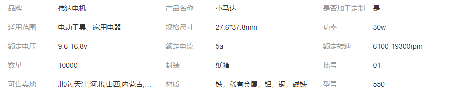 本网页所展示的有关【螺丝刀微型电机16.8V高转速电钻电动工具有刷直流马达_直流电机_佛山市伟达微型电机有限公司】的信息/图片/参数等由全球零部件网的会员【佛山市伟达微型电机有限公司】提供,由全球零部件网会员【佛山市伟达微型电机有限公司】自行对信息/图片/参数等的真实性、准确性和合法性负责,本平台(本网站)仅提供展示服务,请谨慎交易,因交易而产生的法律关系及法律纠纷由您自行协商解决,本平台(本网站)对此不承担任何责任。您在本网页可以浏览【螺丝刀微型电机16.8V高转速电钻电动工具有刷直流马达_直流电机_佛山市伟达微型电机有限公司】有关的信息/图片/价格等及提供【螺丝刀微型电机16.8V高转速电钻电动工具有刷直流马达_直流电机_佛山市伟达微型电机有限公司】的商家公司简介、江南(中国)等信息。