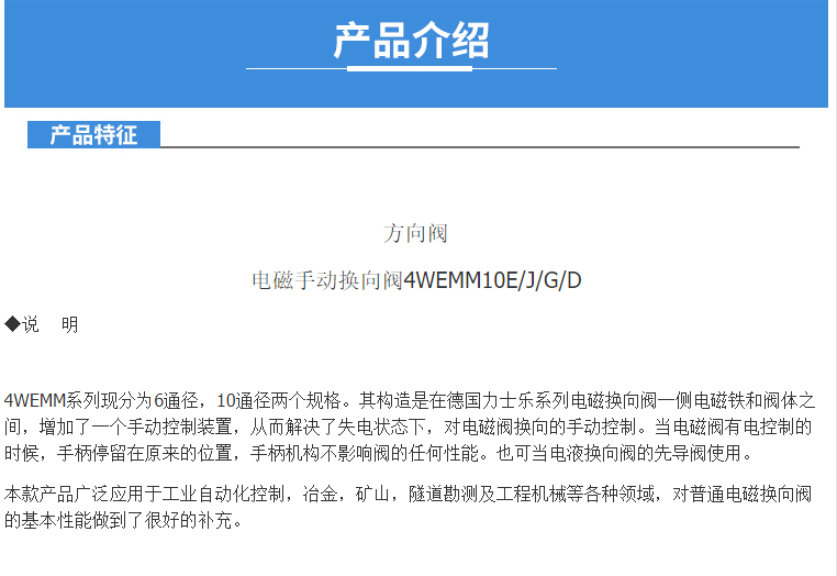 本网页所展示的有关【液压电磁手动换向阀4WEMM 10E 10J10D 6D 6J 6E应急操作杆手柄_电磁阀_福建省泉州申福液压气动设备有限公司】的信息/图片/参数等由全球零部件网的会员【福建省泉州申福液压气动设备有限公司】提供,由全球零部件网会员【福建省泉州申福液压气动设备有限公司】自行对信息/图片/参数等的真实性、准确性和合法性负责,本平台(本网站)仅提供展示服务,请谨慎交易,因交易而产生的法律关系及法律纠纷由您自行协商解决,本平台(本网站)对此不承担任何责任。您在本网页可以浏览【液压电磁手动换向阀4WEMM 10E 10J10D 6D 6J 6E应急操作杆手柄_电磁阀_福建省泉州申福液压气动设备有限公司】有关的信息/图片/价格等及提供【液压电磁手动换向阀4WEMM 10E 10J10D 6D 6J 6E应急操作杆手柄_电磁阀_福建省泉州申福液压气动设备有限公司】的商家公司简介、江南(中国)等信息。