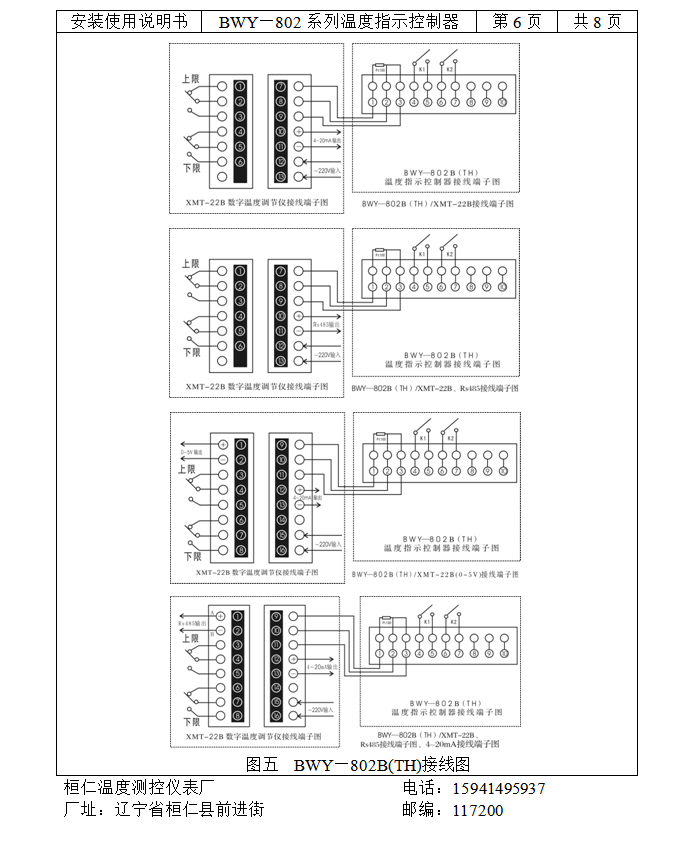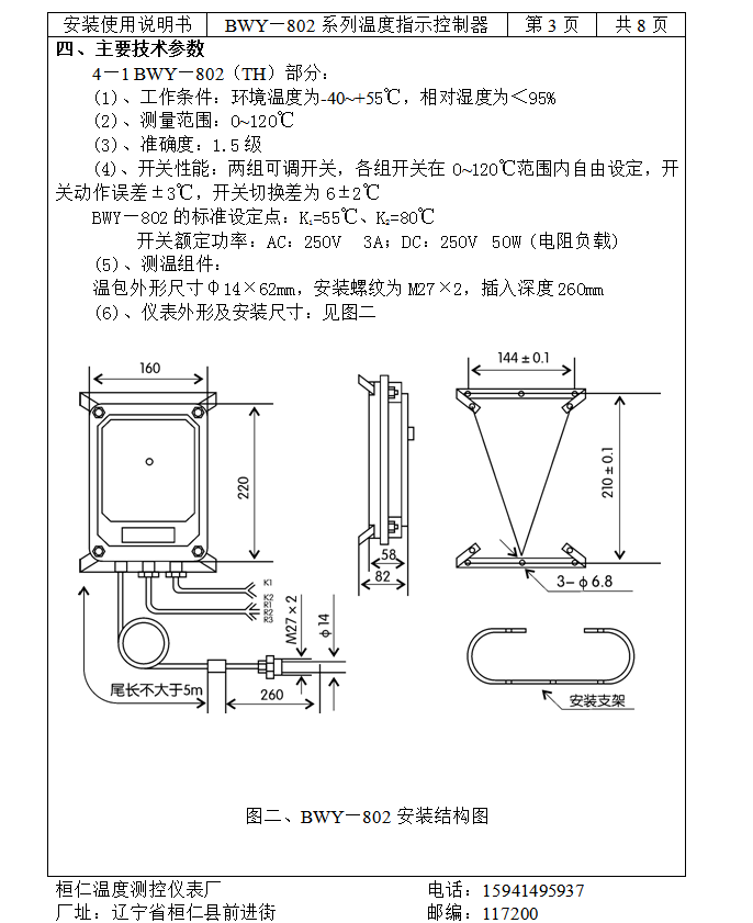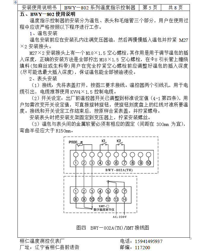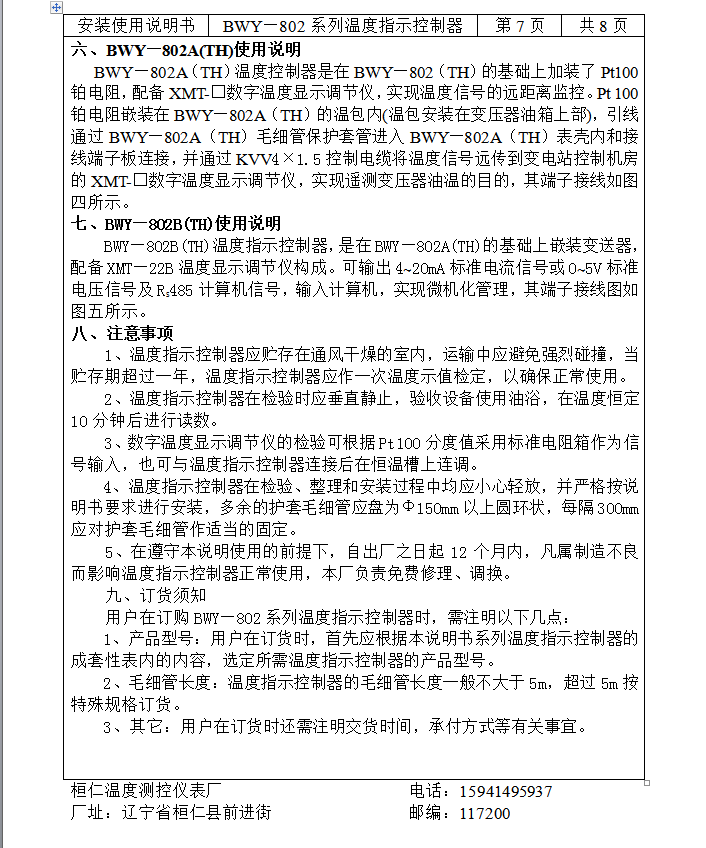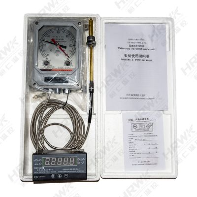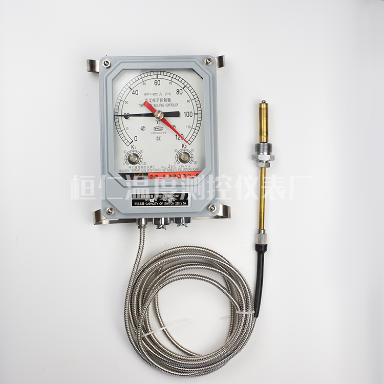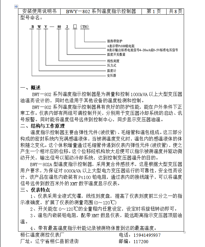BWY—802系列温度指示控制器具有良好的防护性能,能在户外条件下正常工作。仪表内部有两组可调控制开关,分别用于变压器冷却系统的启动、讯号报警。同时能将温度信号远传到控制中心,同步显示变压器油温。