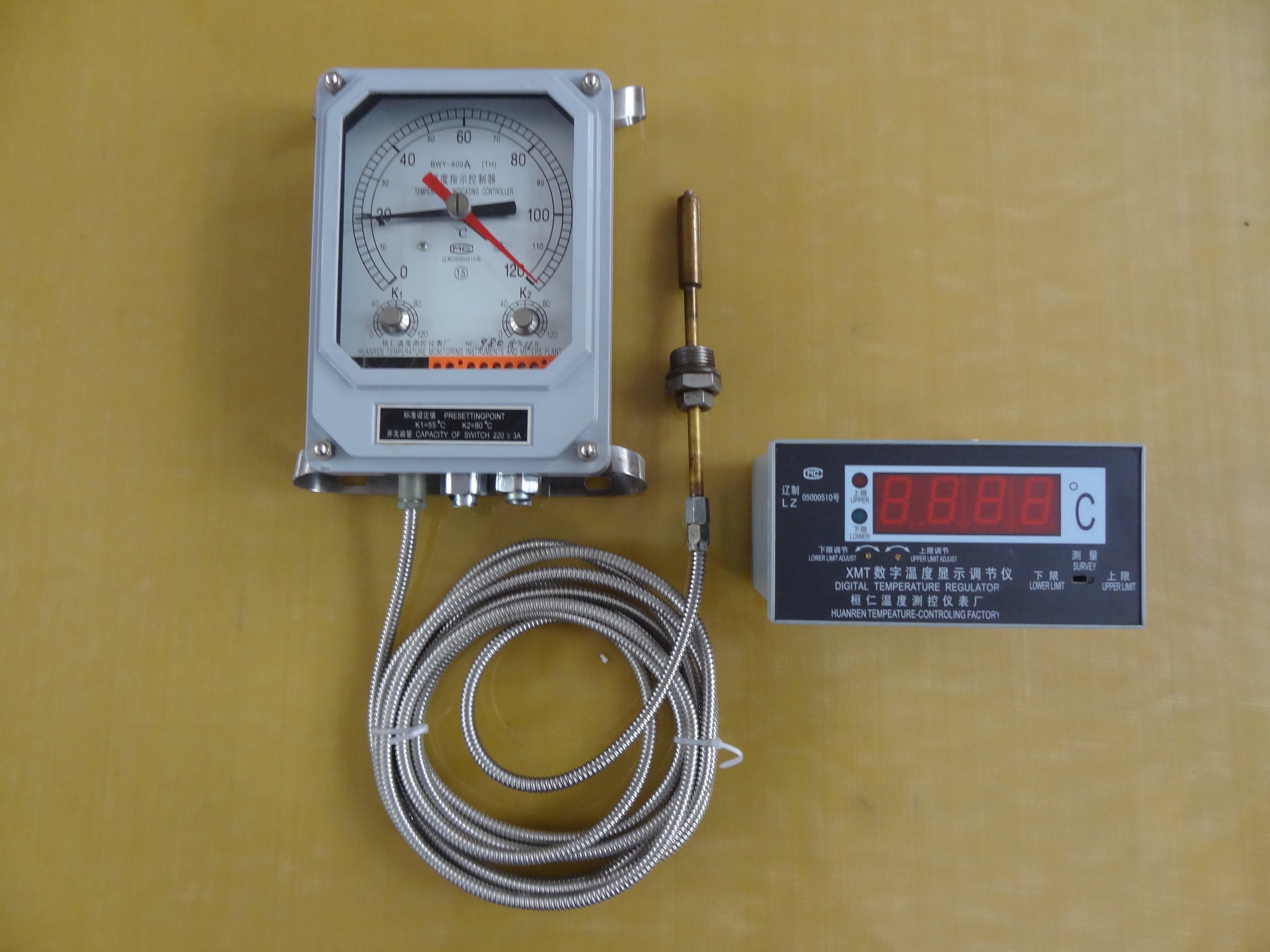 (4)、开关性能:两组可调开关,各组开关在0~120℃范围内自由设定,开关动作误差±3℃,开关切换差为6±2℃