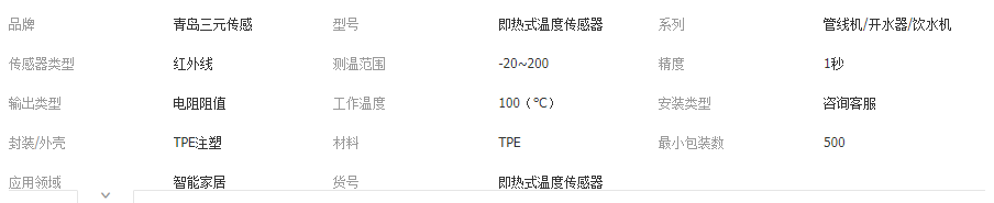 本网页所展示的有关【即热式热水器感温探头 NTC温度传感器 饮水机即热式温度传感器_传感器_青岛三元传感技术有限公司】的信息/图片/参数等由全球零部件网的会员【青岛三元传感技术有限公司】提供,由全球零部件网会员【青岛三元传感技术有限公司】自行对信息/图片/参数等的真实性、准确性和合法性负责,本平台(本网站)仅提供展示服务,请谨慎交易,因交易而产生的法律关系及法律纠纷由您自行协商解决,本平台(本网站)对此不承担任何责任。您在本网页可以浏览【即热式热水器感温探头 NTC温度传感器 饮水机即热式温度传感器_传感器_青岛三元传感技术有限公司】有关的信息/图片/价格等及提供【即热式热水器感温探头 NTC温度传感器 饮水机即热式温度传感器_传感器_青岛三元传感技术有限公司】的商家公司简介、江南(中国)等信息。