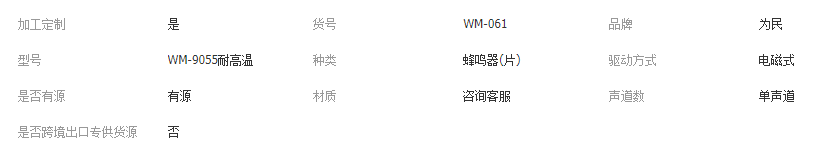 本网页所展示的有关【厂家直供WM-9055 蜂鸣器一体有源3V蜂鸣器耐高温蜂鸣器片_蜂鸣器_宿迁市为民电子科技有限公司】的信息/图片/参数等由全球零部件网的会员【宿迁市为民电子科技有限公司】提供,由全球零部件网会员【宿迁市为民电子科技有限公司】自行对信息/图片/参数等的真实性、准确性和合法性负责,本平台(本网站)仅提供展示服务,请谨慎交易,因交易而产生的法律关系及法律纠纷由您自行协商解决,本平台(本网站)对此不承担任何责任。您在本网页可以浏览【厂家直供WM-9055 蜂鸣器一体有源3V蜂鸣器耐高温蜂鸣器片_蜂鸣器_宿迁市为民电子科技有限公司】有关的信息/图片/价格等及提供【厂家直供WM-9055 蜂鸣器一体有源3V蜂鸣器耐高温蜂鸣器片_蜂鸣器_宿迁市为民电子科技有限公司】的商家公司简介、江南(中国)等信息。