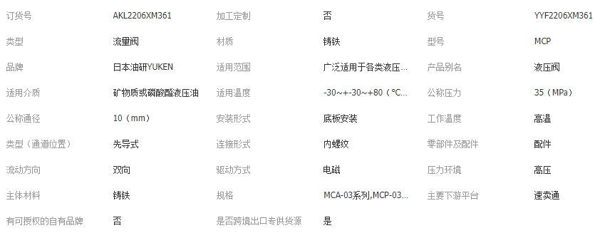 本网页所展示的有关【日本YUKEN油研 MCP/MCT/MCA/MCB-01/03-0/2-10/20/30叠加式 单向阀_电磁阀_厦门艾可勒自动化科技有限公司】的信息/图片/参数等由全球零部件网的会员【厦门艾可勒自动化科技有限公司】提供,由全球零部件网会员【厦门艾可勒自动化科技有限公司】自行对信息/图片/参数等的真实性、准确性和合法性负责,本平台(本网站)仅提供展示服务,请谨慎交易,因交易而产生的法律关系及法律纠纷由您自行协商解决,本平台(本网站)对此不承担任何责任。您在本网页可以浏览【日本YUKEN油研 MCP/MCT/MCA/MCB-01/03-0/2-10/20/30叠加式 单向阀_电磁阀_厦门艾可勒自动化科技有限公司】有关的信息/图片/价格等及提供【日本YUKEN油研 MCP/MCT/MCA/MCB-01/03-0/2-10/20/30叠加式 单向阀_电磁阀_厦门艾可勒自动化科技有限公司】的商家公司简介、江南(中国)等信息。