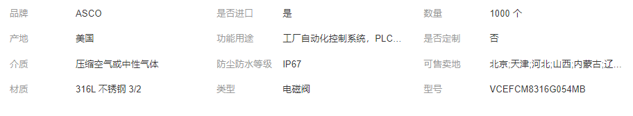 本网页所展示的有关【艾迅自动化代理销售 ASCO浇封防爆电磁阀VCEFCM8316G054MB_电磁阀_无锡艾迅自动化科技有限公司】的信息/图片/参数等由全球零部件网的会员【无锡艾迅自动化科技有限公司】提供,由全球零部件网会员【无锡艾迅自动化科技有限公司】自行对信息/图片/参数等的真实性、准确性和合法性负责,本平台(本网站)仅提供展示服务,请谨慎交易,因交易而产生的法律关系及法律纠纷由您自行协商解决,本平台(本网站)对此不承担任何责任。您在本网页可以浏览【艾迅自动化代理销售 ASCO浇封防爆电磁阀VCEFCM8316G054MB_电磁阀_无锡艾迅自动化科技有限公司】有关的信息/图片/价格等及提供【艾迅自动化代理销售 ASCO浇封防爆电磁阀VCEFCM8316G054MB_电磁阀_无锡艾迅自动化科技有限公司】的商家公司简介、江南(中国)等信息。