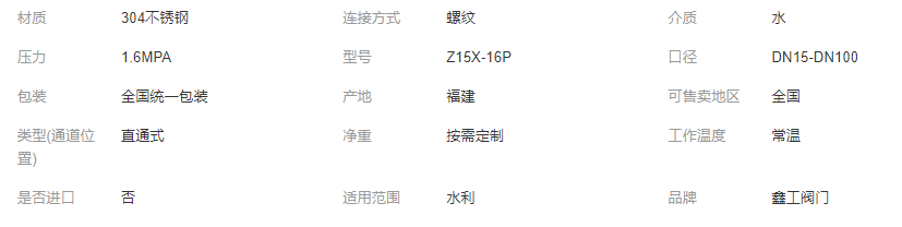 本网页所展示的有关【鑫工阀门不锈钢闸阀304水开关丝扣口水管磁性锁闭阀4分6分1寸丝接_闸阀_福建鑫工阀门有限公司】的信息/图片/参数等由全球零部件网的会员【福建鑫工阀门有限公司】提供,由全球零部件网会员【福建鑫工阀门有限公司】自行对信息/图片/参数等的真实性、准确性和合法性负责,本平台(本网站)仅提供展示服务,请谨慎交易,因交易而产生的法律关系及法律纠纷由您自行协商解决,本平台(本网站)对此不承担任何责任。您在本网页可以浏览【鑫工阀门不锈钢闸阀304水开关丝扣口水管磁性锁闭阀4分6分1寸丝接_闸阀_福建鑫工阀门有限公司】有关的信息/图片/价格等及提供【鑫工阀门不锈钢闸阀304水开关丝扣口水管磁性锁闭阀4分6分1寸丝接_闸阀_福建鑫工阀门有限公司】的商家公司简介、江南(中国)等信息。