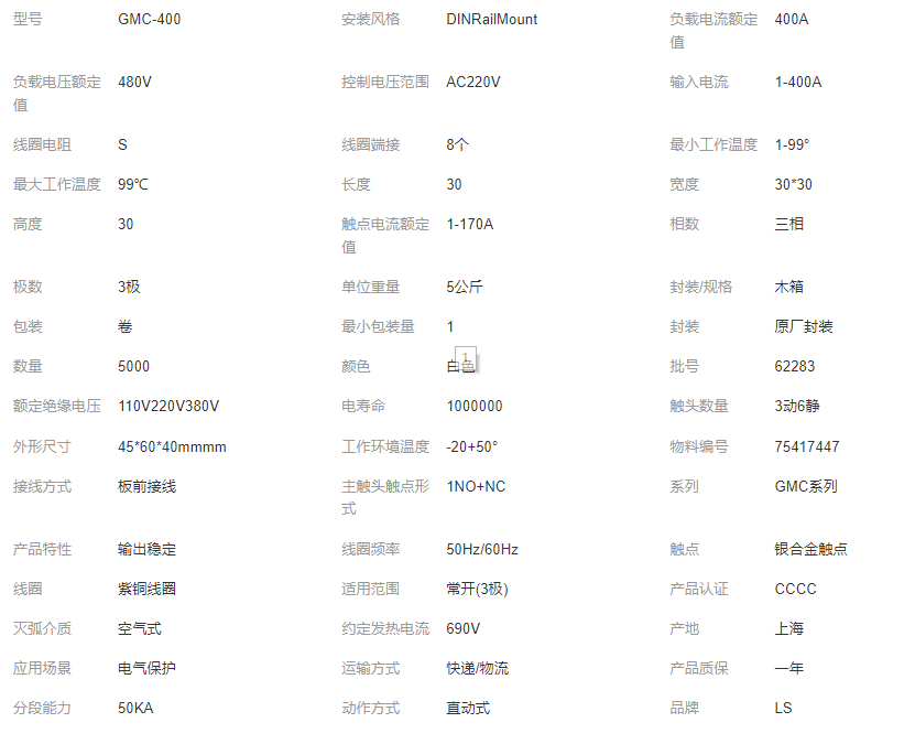 本网页所展示的有关【原装LS产电断路器交流接触器GMC-400 线圈电压AC380V-450V规格_电磁阀线圈_温州龙齐电气有限公司】的信息/图片/参数等由全球零部件网的会员【温州龙齐电气有限公司】提供,由全球零部件网会员【温州龙齐电气有限公司】自行对信息/图片/参数等的真实性、准确性和合法性负责,本平台(本网站)仅提供展示服务,请谨慎交易,因交易而产生的法律关系及法律纠纷由您自行协商解决,本平台(本网站)对此不承担任何责任。您在本网页可以浏览【原装LS产电断路器交流接触器GMC-400 线圈电压AC380V-450V规格_电磁阀线圈_温州龙齐电气有限公司】有关的信息/图片/价格等及提供【原装LS产电断路器交流接触器GMC-400 线圈电压AC380V-450V规格_电磁阀线圈_温州龙齐电气有限公司】的商家公司简介、江南(中国)等信息。