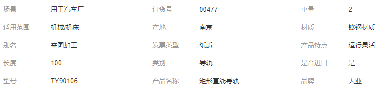 本网页所展示的有关【TY90106 矩形直线导轨 天亚 用于汽车厂 运行灵活 来图加工 镶钢材质_导轨_南京天亚机械刀片有限公司】的信息/图片/参数等由全球零部件网的会员【南京天亚机械刀片有限公司】提供,由全球零部件网会员【南京天亚机械刀片有限公司】自行对信息/图片/参数等的真实性、准确性和合法性负责,本平台(本网站)仅提供展示服务,请谨慎交易,因交易而产生的法律关系及法律纠纷由您自行协商解决,本平台(本网站)对此不承担任何责任。您在本网页可以浏览【TY90106 矩形直线导轨 天亚 用于汽车厂 运行灵活 来图加工 镶钢材质_导轨_南京天亚机械刀片有限公司】有关的信息/图片/价格等及提供【TY90106 矩形直线导轨 天亚 用于汽车厂 运行灵活 来图加工 镶钢材质_导轨_南京天亚机械刀片有限公司】的商家公司简介、江南(中国)等信息。