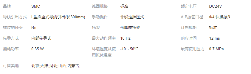 字段描述 字段取值 取值描述系列 3 SY3000机能 1 2位单电控线圈规格 - 标准额定电压 5 DC24V导线引出方式 L L型插座式导线引出(长300mm)LED及过电压保护回路 - 无指示灯·过电压保护回路手动操作 - 非锁定推压式A·B接管口径 C4 Φ4 快换接头螺纹的种类 - Rc托架 F1 带脚座托架订制规格 - 标准CE对应 - -