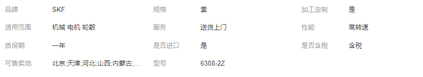 本网页所展示的有关【SKF6308-2Z轴承 原装进口 批发销售 假一赔十 全国免费送货_轴承_上海凯曼轴承有限公司】的信息/图片/参数等由全球零部件网的会员【上海凯曼轴承有限公司】提供,由全球零部件网会员【上海凯曼轴承有限公司】自行对信息/图片/参数等的真实性、准确性和合法性负责,本平台(本网站)仅提供展示服务,请谨慎交易,因交易而产生的法律关系及法律纠纷由您自行协商解决,本平台(本网站)对此不承担任何责任。您在本网页可以浏览【SKF6308-2Z轴承 原装进口 批发销售 假一赔十 全国免费送货_轴承_上海凯曼轴承有限公司】有关的信息/图片/价格等及提供【SKF6308-2Z轴承 原装进口 批发销售 假一赔十 全国免费送货_轴承_上海凯曼轴承有限公司】的商家公司简介、江南(中国)等信息。