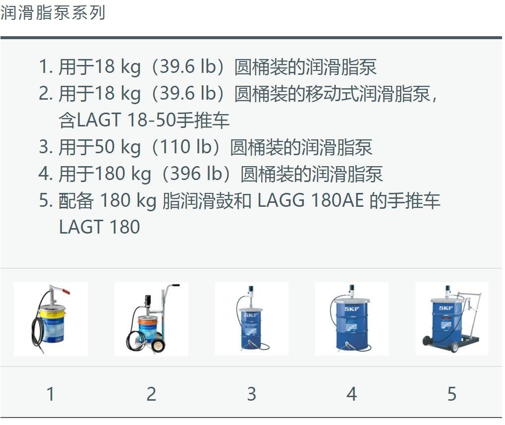- 全系列产品;可提供用于18、50或180 kg(39、110 或 400 lb)圆桶的润滑脂泵