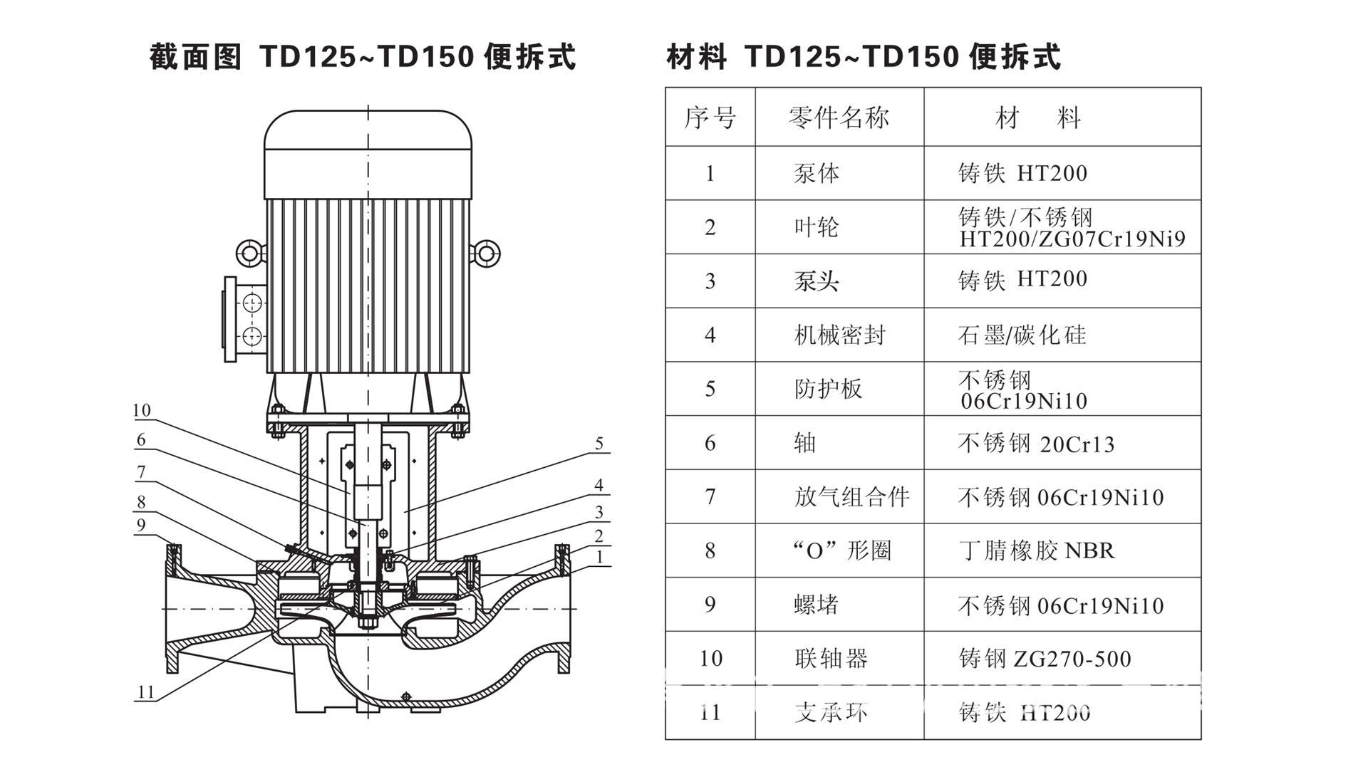 8、 为满足客户的不同需要,TD32~-TD150产品分为带底板和不带底板两种。(底板尺寸见附件) TD125-40G/4SWGRB防爆管道泵性能参数:流量:160立方米/小时;扬程:40米;转速:1480转/分钟;电机功率:30KW. TD125-40G/4SWGRB防爆管道泵适宜在清洁、稀薄、非侵蚀、非易燃易爆,且不含有任何可能对泵造成机械或化学损害的固体颗粒和纤维的液体中使用。具体对液体要求及应用如下表2;而在液体粘稠或密度较大情况下使用时会造成泵特性曲线的下降和能耗的增加。 液体温度: -15C~ 110C 最大工作压力:常规型为PN12巴;特殊型为PN16巴。 TD125-40G/4SWGRB防爆管道泵型号含义为:TD-----------------管道循环泵;125----------------------吸排口的额定直径DN为125毫米(mm);40-------------------额定扬程为40米(m);G--------------------新一代;4--------------------电机极数;S------------------三相;W------------------50HZ;G------------------叶轮铸钢;R------------------高温高压型;B------------------防爆电机. TD125-40G/4SWGRB防爆管道泵配有标准电机和机械密封。此类产品的结构与相近类型产品相比,更不易受到泵送液体中杂质的影响。 产品设计为顶部可拉出的拆装形式,其可以在不影响管路系统的情况下对泵进行维修。所有泵采用创新式便拆式机械密封,更换机械密封无需拆卸电机。 TD125-40G/4SWGRB防爆管道泵产品结构 TD125-40G/4SWGRB防爆管道泵采用电机与泵可分离式结构,泵部分设计为可拉出形式。所有的该类产品都配有标准电机和机械密封。电机为全封闭、风冷式标准电机。其主要尺寸符合JB/T8680标准。 TD125-40G/4SWGRB防爆管道泵泵体相当于一段管路。在泵进行维修时,可以用盲法兰将泵体封堵,从而不影响系统的正常运行。 TD125-40G/4SWGRB防爆管道泵的联接法兰尺寸符合GBT17241.6或IS07005-2/DIN2501标准中PN16时的有关规定。 TD125-40G/4SWGRB防爆管道泵的进出口直径符合有关标准尺寸。 TD125-40G/4SWGRB防爆管道泵的泵头是联接电机和泵的装置,其与泵体之间的密封件采用"0"形圈。 TD125-40G/4SWGRB防爆管道泵曲线条件
