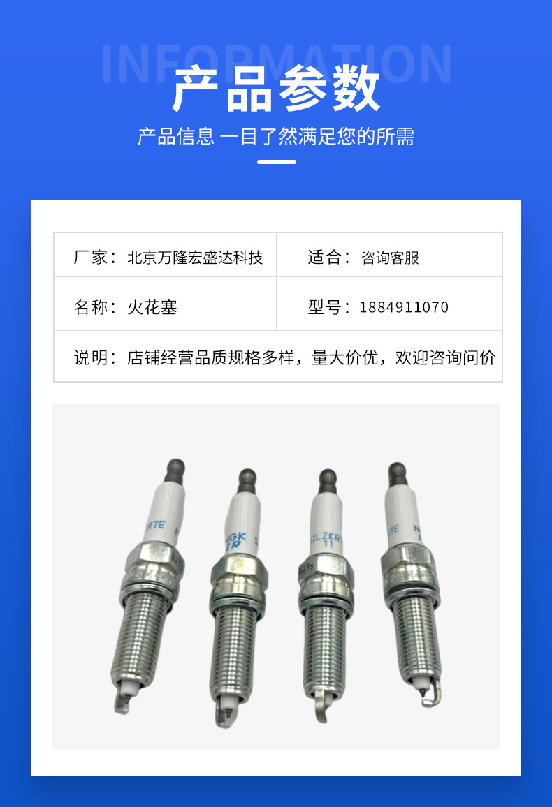 本网页所展示的有关【1884911070 火花塞多种规格适用于现代起亚汽车配件量大优惠_火花塞_北京万隆宏盛达科技有限公司】的信息/图片/参数等由全球零部件网的会员【北京万隆宏盛达科技有限公司】提供,由全球零部件网会员【北京万隆宏盛达科技有限公司】自行对信息/图片/参数等的真实性、准确性和合法性负责,本平台(本网站)仅提供展示服务,请谨慎交易,因交易而产生的法律关系及法律纠纷由您自行协商解决,本平台(本网站)对此不承担任何责任。您在本网页可以浏览【1884911070 火花塞多种规格适用于现代起亚汽车配件量大优惠_火花塞_北京万隆宏盛达科技有限公司】有关的信息/图片/价格等及提供【1884911070 火花塞多种规格适用于现代起亚汽车配件量大优惠_火花塞_北京万隆宏盛达科技有限公司】的商家公司简介、江南(中国)等信息。