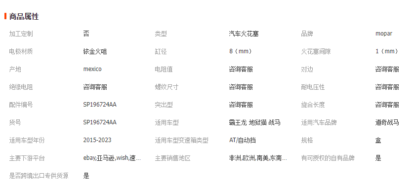 本网页所展示的有关【mopar正品适用于道奇霸王龙 道奇地狱猫6.2L 6.4L火花塞_火花塞_北京博雅昊通商贸有限公司】的信息/图片/参数等由全球零部件网的会员【北京博雅昊通商贸有限公司】提供,由全球零部件网会员【北京博雅昊通商贸有限公司】自行对信息/图片/参数等的真实性、准确性和合法性负责,本平台(本网站)仅提供展示服务,请谨慎交易,因交易而产生的法律关系及法律纠纷由您自行协商解决,本平台(本网站)对此不承担任何责任。您在本网页可以浏览【mopar正品适用于道奇霸王龙 道奇地狱猫6.2L 6.4L火花塞_火花塞_北京博雅昊通商贸有限公司】有关的信息/图片/价格等及提供【mopar正品适用于道奇霸王龙 道奇地狱猫6.2L 6.4L火花塞_火花塞_北京博雅昊通商贸有限公司】的商家公司简介、江南(中国)等信息。