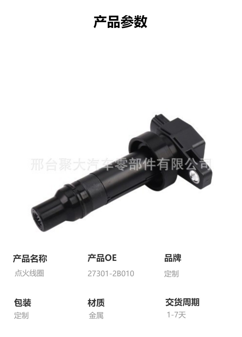 本网页所展示的有关【源头工厂高品质27301-2B010 273012B010点火线圈适用于现代起亚_点火线圈_邢台聚大汽车零部件有限公司】的信息/图片/参数等由全球零部件网的会员【邢台聚大汽车零部件有限公司】提供,由全球零部件网会员【邢台聚大汽车零部件有限公司】自行对信息/图片/参数等的真实性、准确性和合法性负责,本平台(本网站)仅提供展示服务,请谨慎交易,因交易而产生的法律关系及法律纠纷由您自行协商解决,本平台(本网站)对此不承担任何责任。您在本网页可以浏览【源头工厂高品质27301-2B010 273012B010点火线圈适用于现代起亚_点火线圈_邢台聚大汽车零部件有限公司】有关的信息/图片/价格等及提供【源头工厂高品质27301-2B010 273012B010点火线圈适用于现代起亚_点火线圈_邢台聚大汽车零部件有限公司】的商家公司简介、江南(中国)等信息。
