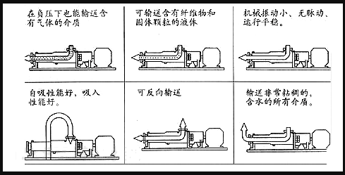 含有颗粒或纤维的介质:颗粒直径可以这30mm(不超过转子偏心距)。纤维长可以350mm(相当0.4位转子的螺距)。其含量一般可达介质窖的40%,若介质中的固体物为细微之粉沫状时,较高含量可达 60%或更高也能输送。