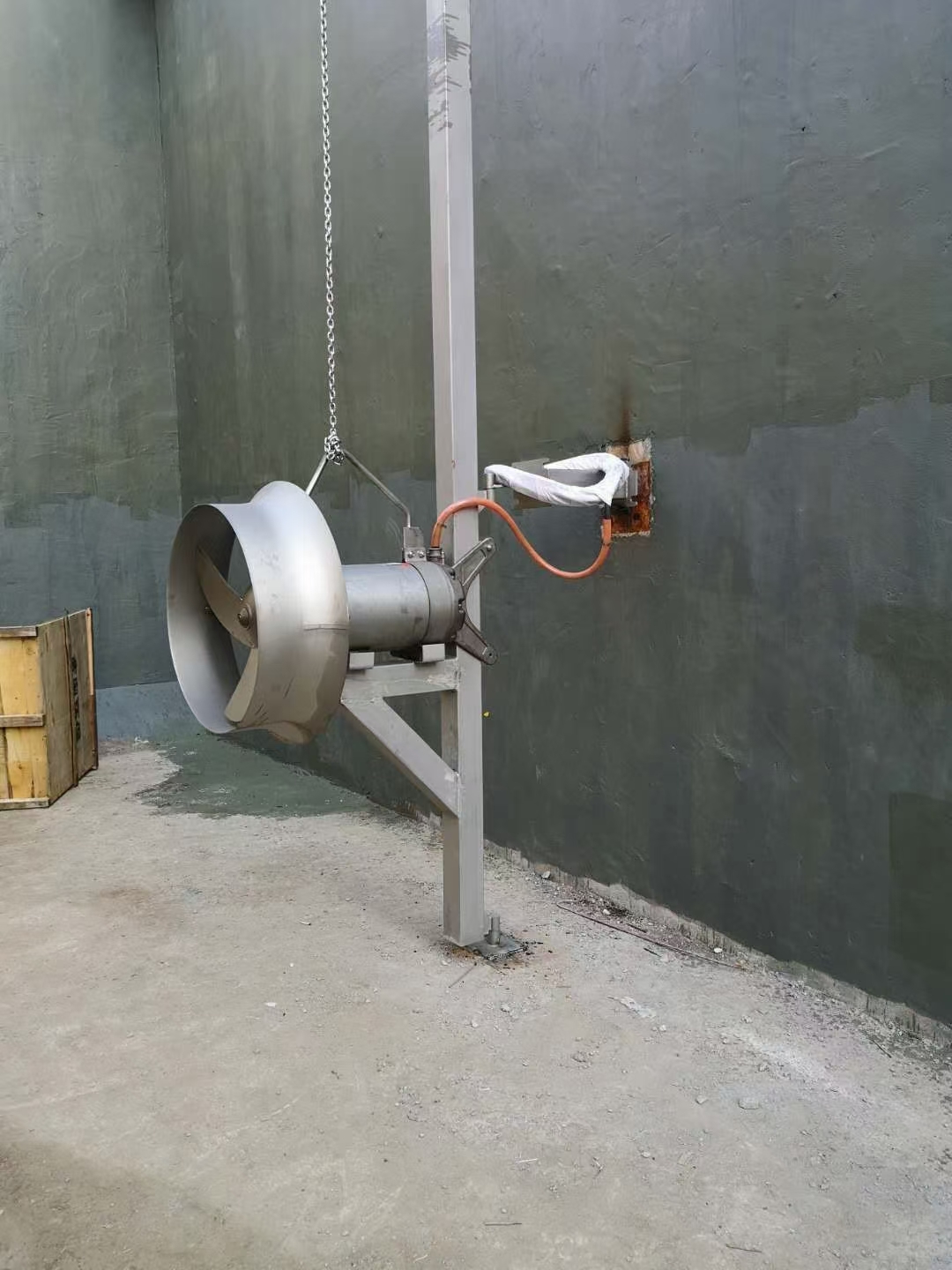 潜水搅拌机的安装导杆能保证设备自由转动、升降、调节各种角度,提升和安装搅拌机也不必要把池子放空;
