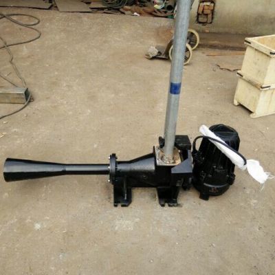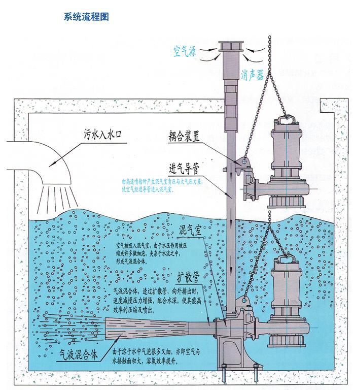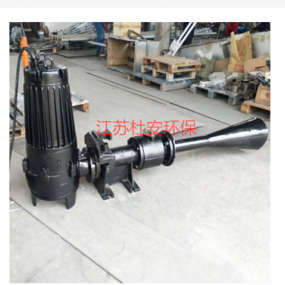 深水自吸式潜水射流曝气机主要由WQ型潜水排污泵、文丘里管、扩散管、进气管及消声器等组成。工作原理为:潜水电泵产生的水流经过喷嘴形成高速水流,在喷嘴周围形成负压由进气管吸入空气,形成液气混合流高速喷射而出,夹带许多气泡的水流在较大面积和深度的水域里涡旋搅拌,完成曝气与增氧功能。